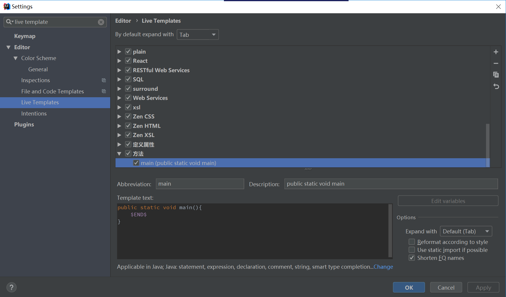 按住Ctrl + Shift + A,通过Help,输入Live Template(或者在Edit菜单栏下Setting),打开对话框